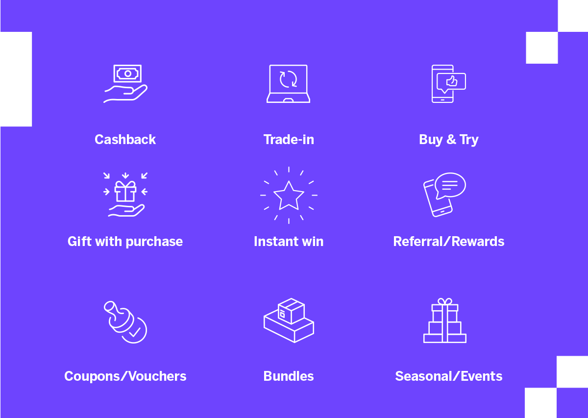 Cashback, trade-in, buy & try, gift with purchase, and instant-win campaigns tend to deliver the strongest results across industries.
